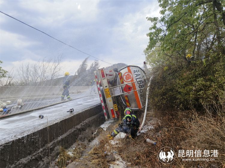 6686体育讯 记者劳学丽 通讯员刘剑飞 4月24日下午,一辆满载20吨柴油罐车由昆明市秧田冲油库驶向富民县老煤山采石场,途经老煤山三茨路段时为避让对向车辆,不慎侧翻至路边排水沟,罐体与地面撞击后发生泄漏,所幸无人员伤亡。富民消防救援大队接到报警后迅速前往处置险情。