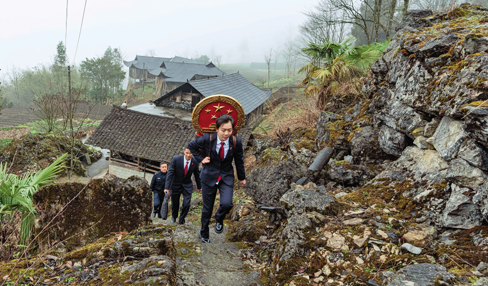 湖北省鹤峰县人民法院积极推行巡回送法进乡村活动,通过现场宣讲、模拟庭审、法律咨询等方式,普及法律知识,化解基层纠纷矛盾,助力乡村振兴。图为法庭工作人员在前往鹤峰县中营镇的路上(2023年2月28日摄) 覃涛摄 / 本刊