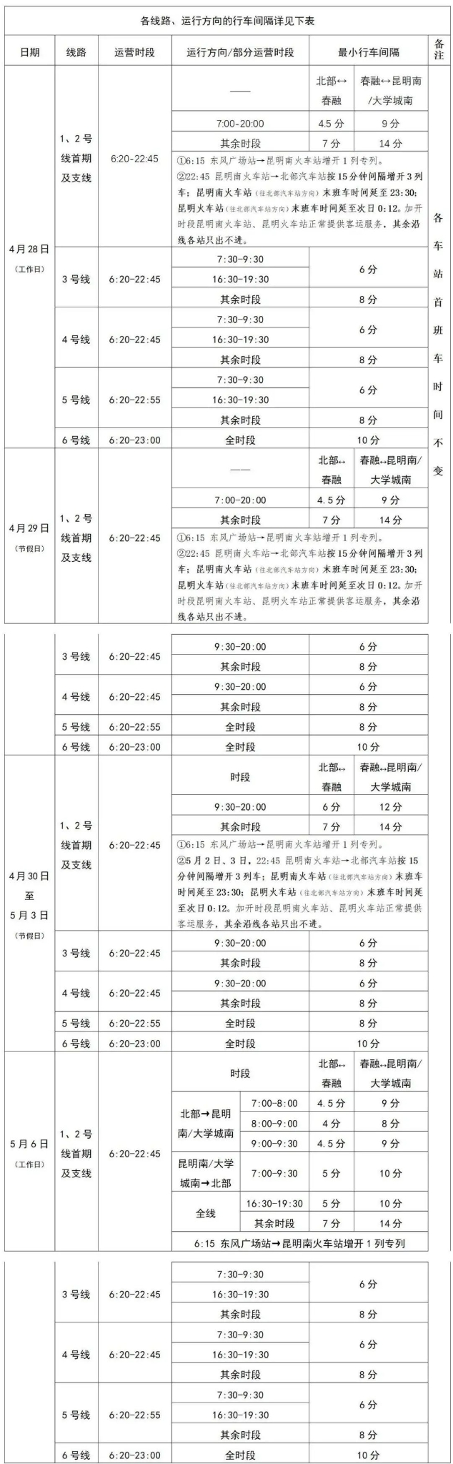 4月28日、4月29日、5月2日、5月3日地铁1号线首期支线昆明南火车站末班车后按15分钟行车间隔延时加开3列载客列车开往北部汽车站;