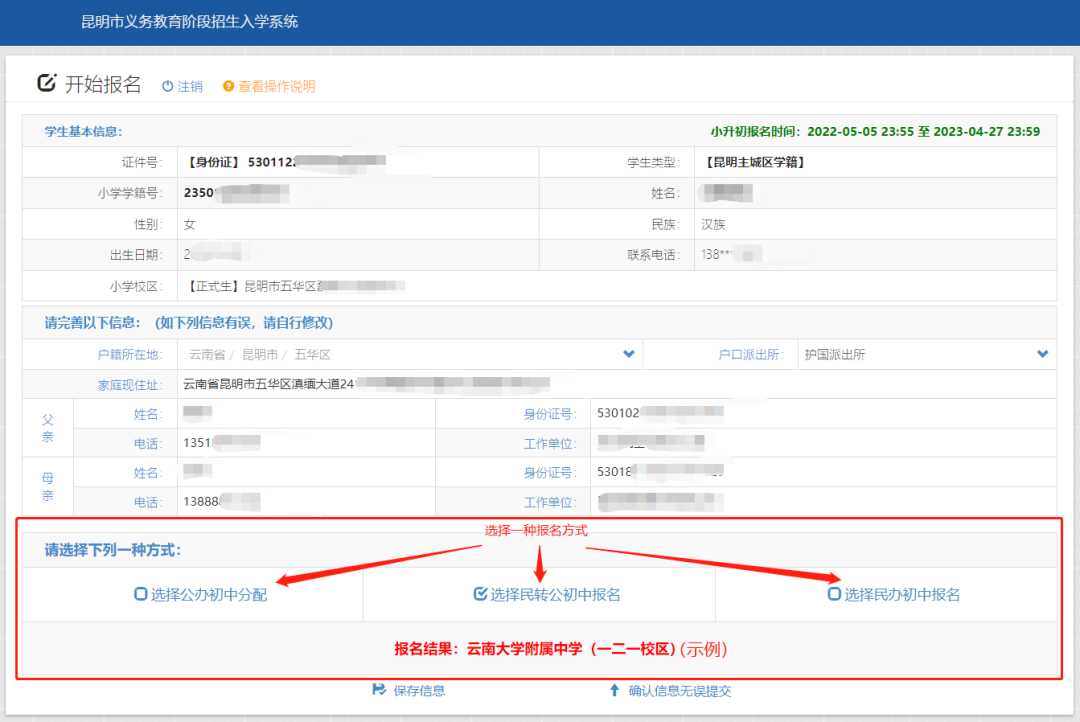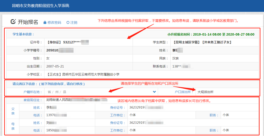 系统会依据前期毕业小学或区教育行政部门在昆明义招网中建立的电子档案,自动填写学生基本信息,请家长根据所列信息修改完善即可。如下图所示: