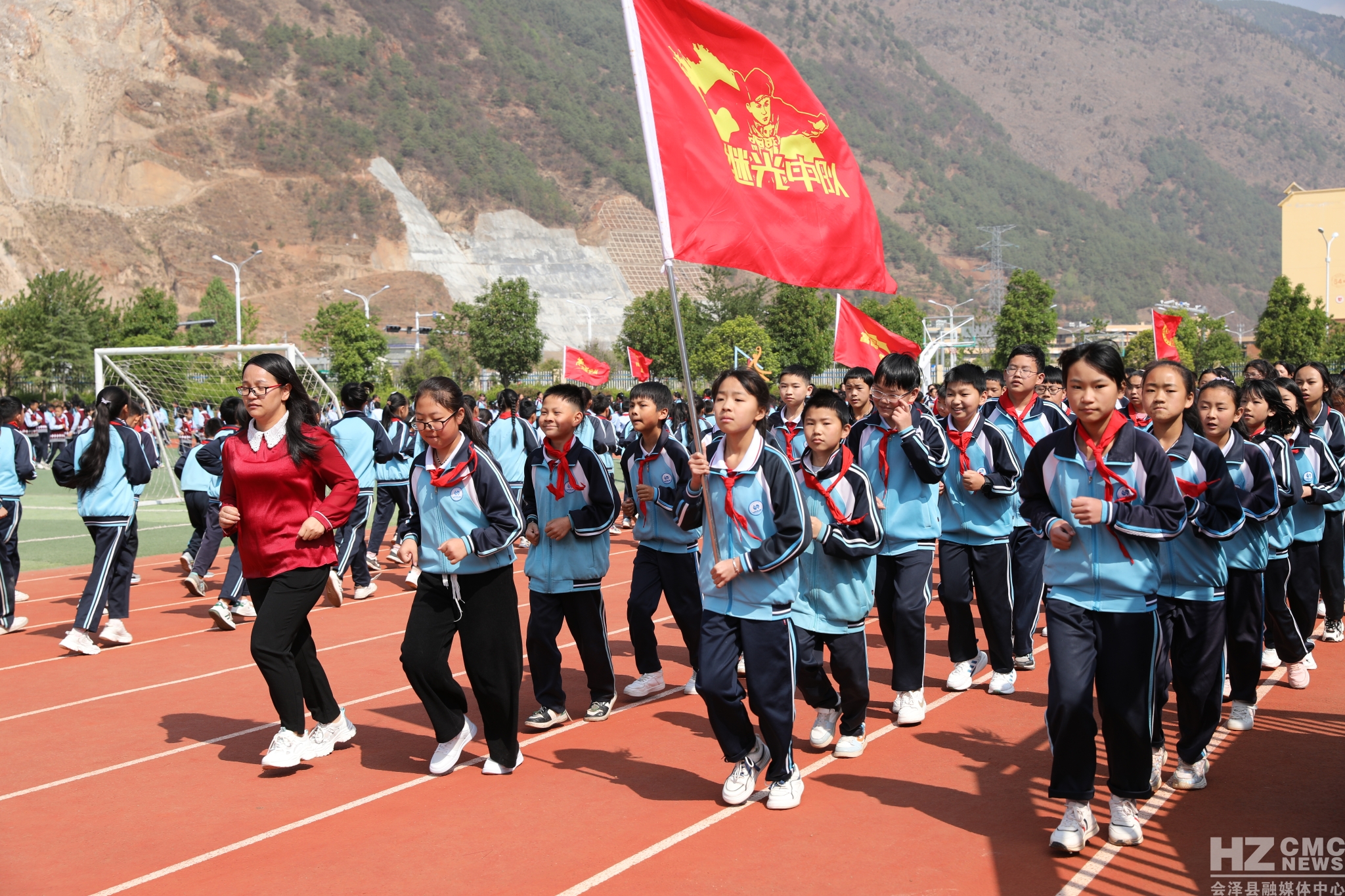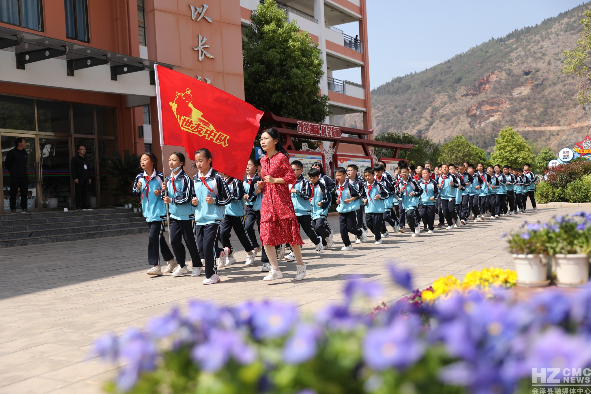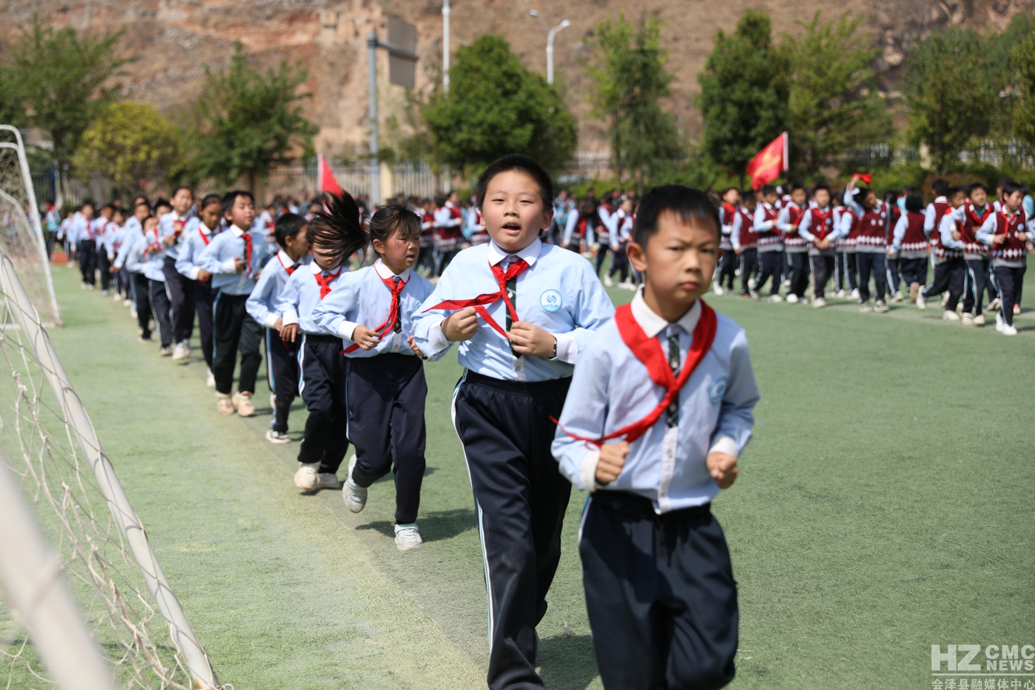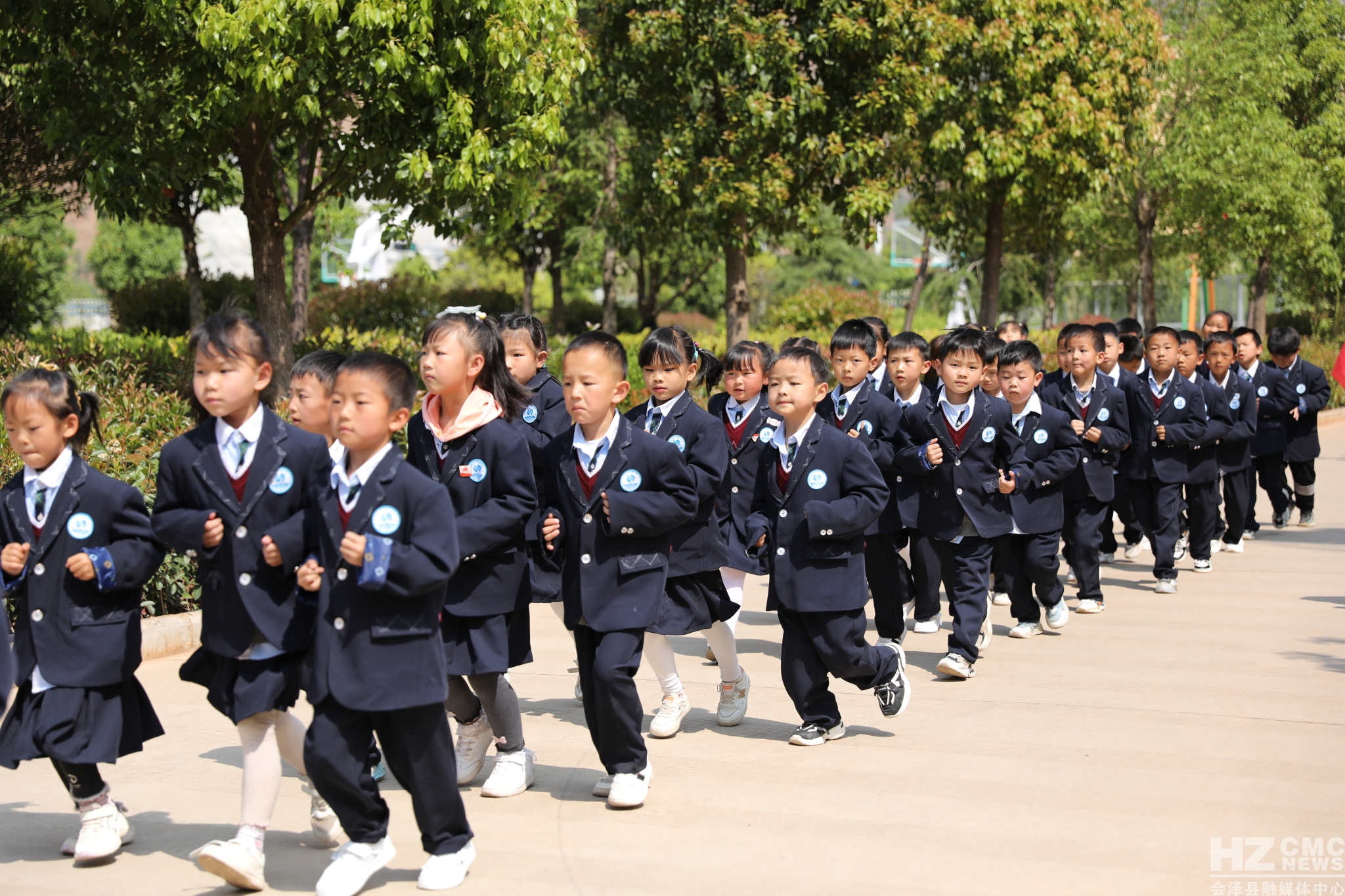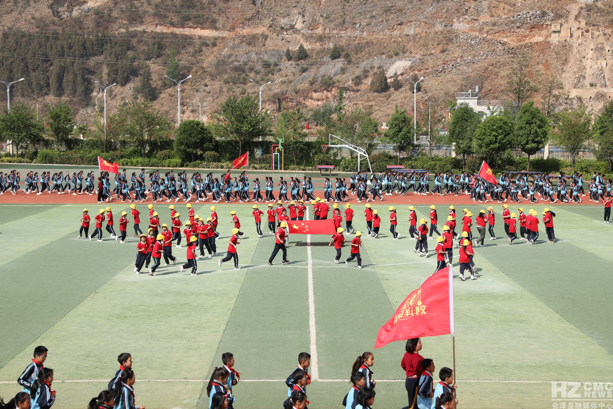 会泽县钟屏小学立足易地搬迁实际,确立以“思源”为核心的校园文化定位,创新体育大课间形式,围绕汉字“中”“国”,词语“思源”“钟屏”首个大写字母“SY”“ZP”及五角星图案进行激情跑操,开展体育大课间活动。