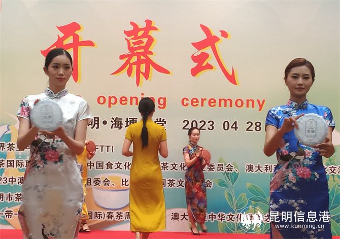 现场还举行了中澳茶文化艺术节启动仪式、昆明市茶业行业协会古茶树植保中心授牌仪式、2023首批滇茶名师颁奖仪式等。专业茶模T台走秀发布了全国88个春茶茶样,展示了薄荷塘、班章、冰岛、曼松、凤凰窝、昔归、景迈、易武(慢撒)、倚邦、蛮砖等著名山头品牌产品。茶企负责人、制茶工程师还与茶模同台亮相,遴选特色名茶进行深度品鉴。