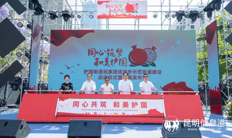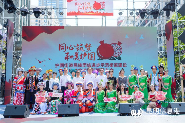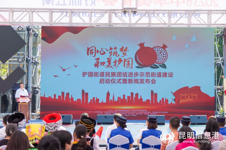 “种下石榴树,开出团结花”。现场,启动仪式卷轴被徐徐展开,“同心筑梦 和美护国”五华区护国街道省级民族团结进步示范街道建设正式开启。舞台上的“石榴红同心树”艺术装置格外引人注目,各族群众纷纷合影,籽籽同心一家亲。