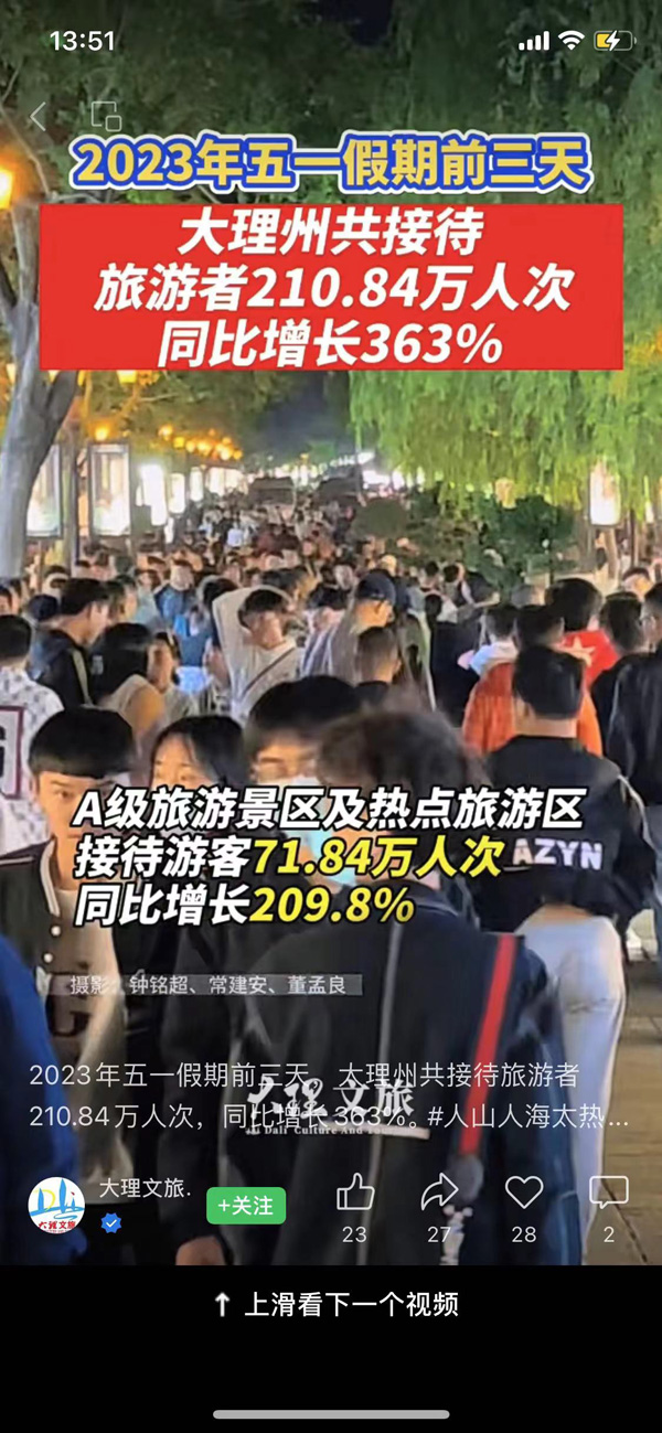 大理旅游“人气”直线飙升,强劲势头不减。4月29日“五一”假期首日,央视新闻就曾报道,“五一”假期旅游市场热度高涨,从搜索大数据看,大理、大理古城成为“五一”假期热门旅游目的地和热门景区之一。