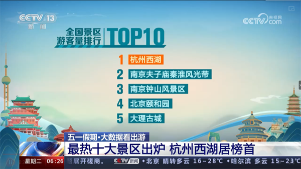 而就在今天,大理古城也登上了央视新闻。据央视新闻5月2日消息4月29日零时至5月1日16时全国游客量排前十的景区分别为: