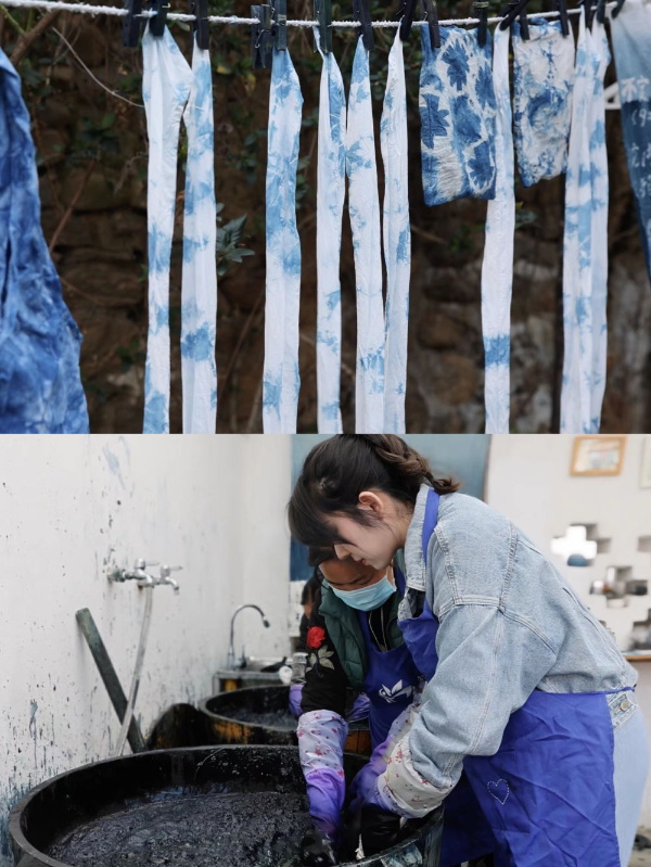 游客在大理市蓝续喜洲田园店体验扎染。新华社记者 曾维 摄