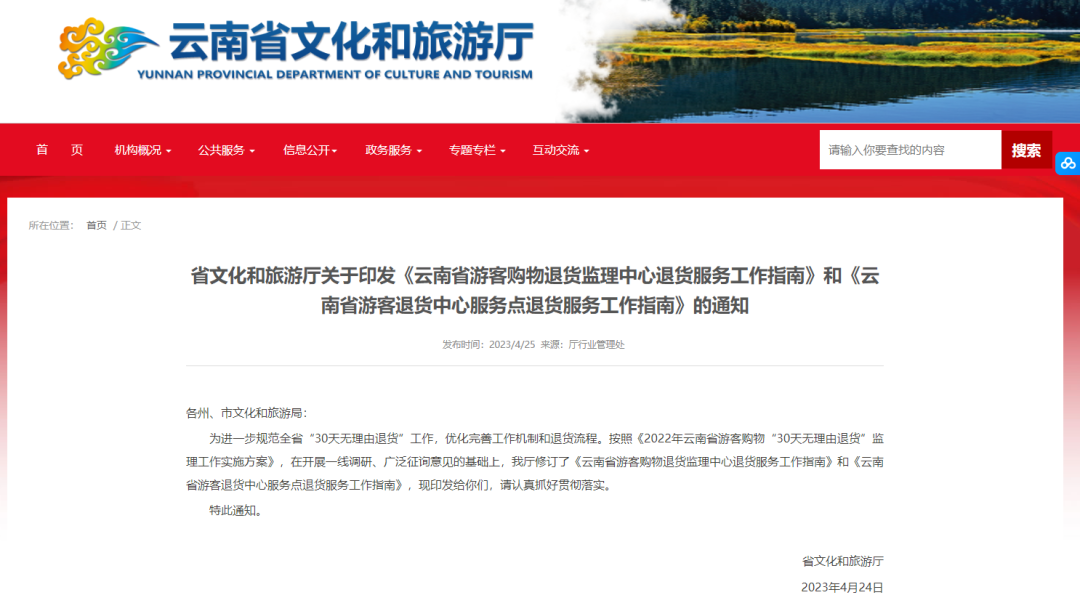 在开展一线调研,广泛征询意见的基础上,近日,云南省文化和旅游厅修订并发布了《云南省游客购物退货监理中心退货服务工作指南》和《云南省游客退货中心服务点退货服务工作指南》,进一步规范全省“30天无理由退货”工作优化完善工作机制和退货流程。