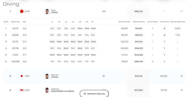 北京时间5月8日凌晨,跳水世界杯蒙特利尔站男子10米台决赛,中国选手杨昊6轮总分580.25分,以领先第二名66.80分的优势夺得冠军。本场比赛6轮动作中,杨昊有4轮得到裁判员10分的评分。尤为值得一提的是,第3轮307C和第5轮109C两个动作,现场7位裁判皆给出了10分的满分评分。