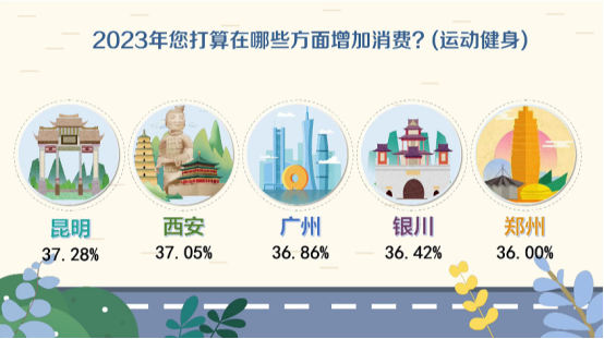 哪些城市的人在运动健身消费意愿更高呢?昆明、西安、广州、银川、郑州是排在榜单前五位的城市。