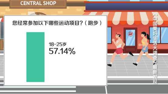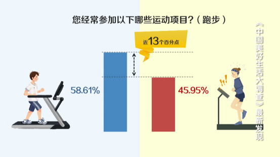 其中,男性对跑步的热衷程度比女性高了近13个百分点(58.61%,45.95%)。