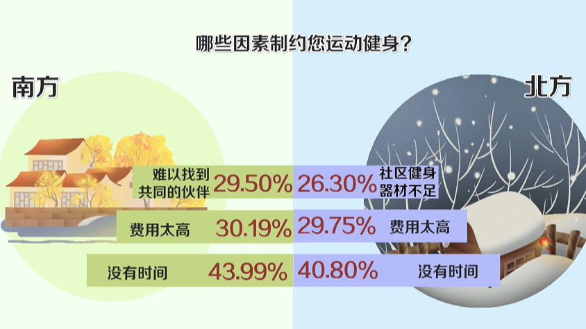 除了没有时间、费用太高外,南方人认为难以找到共同的伙伴是制约他们运动的三大主要因素之一。而北方人认为社区健身器材不足也是制约运动健身的三大主要因素之一,看来北方城市在这方面的建设要再加强。
