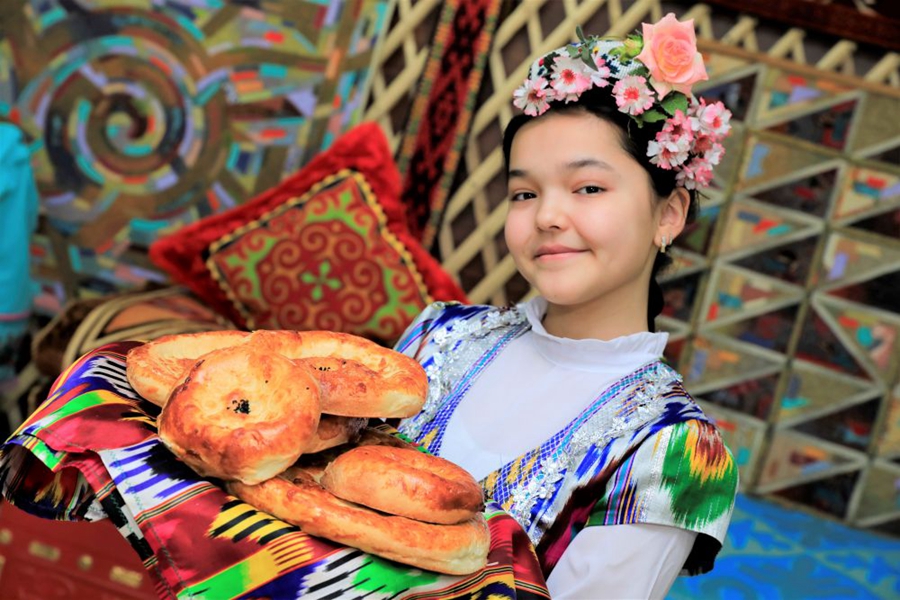 ↑身着民族服饰的哈萨克斯坦女孩在阿斯塔纳展示传统美食,迎接纳乌鲁斯节。
