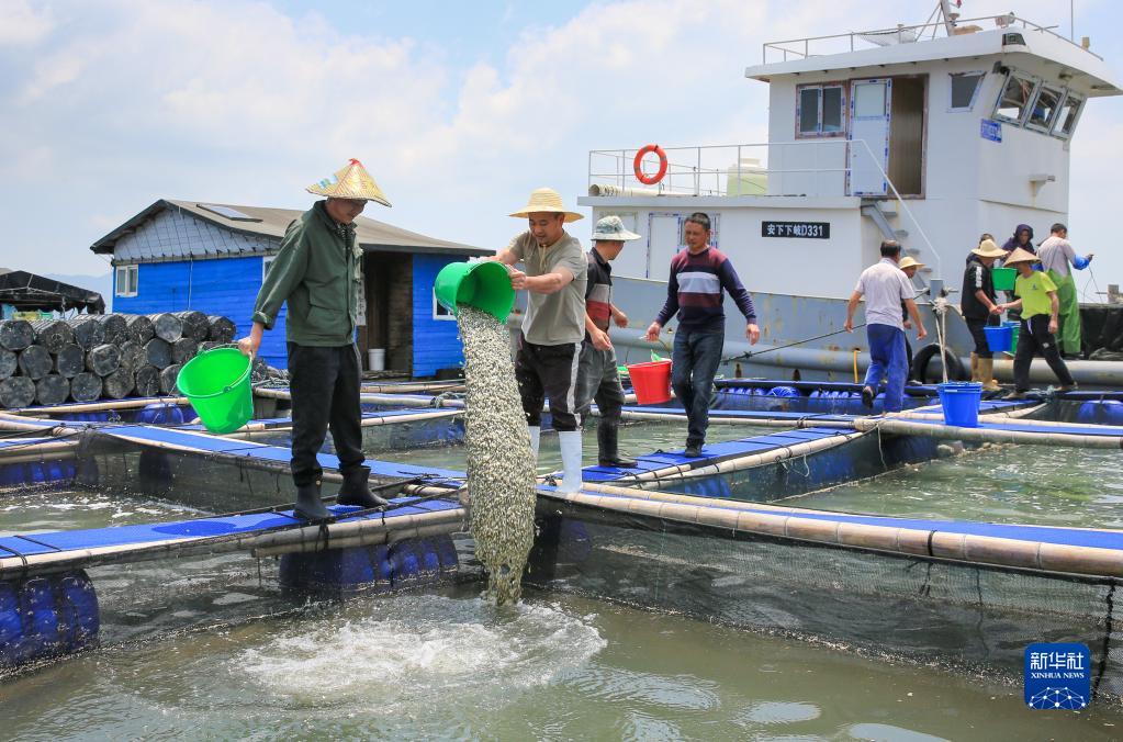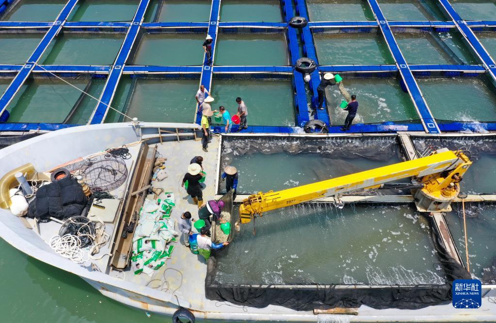5月9日,在福建宁德三都澳东冲口海域新型养殖渔排上,养殖户投放大黄鱼鱼苗。