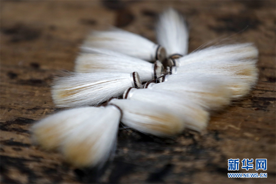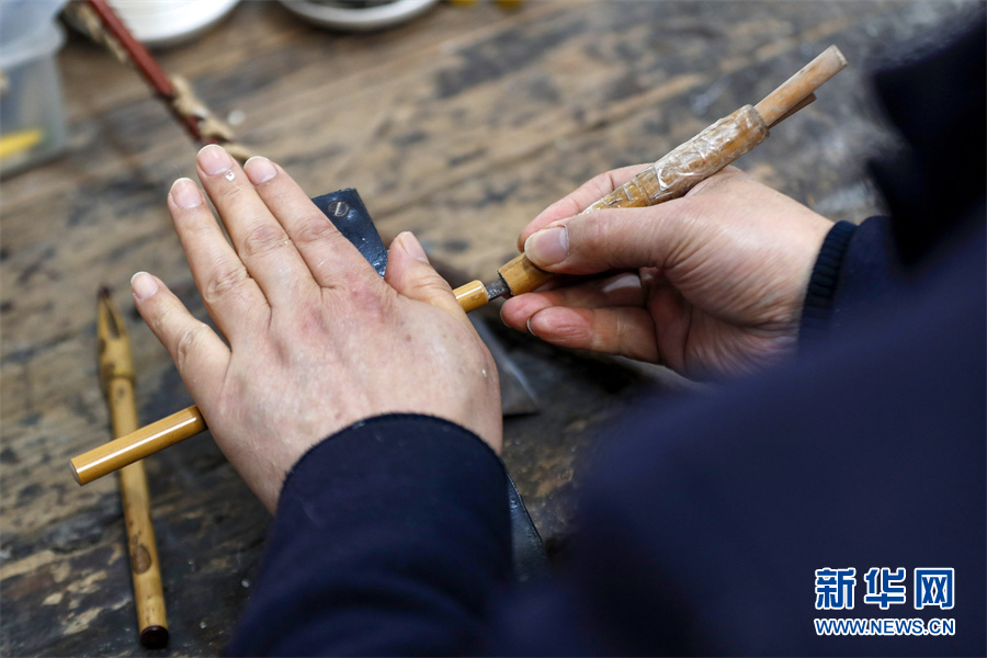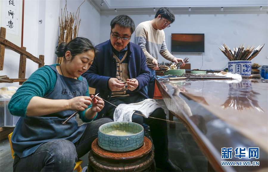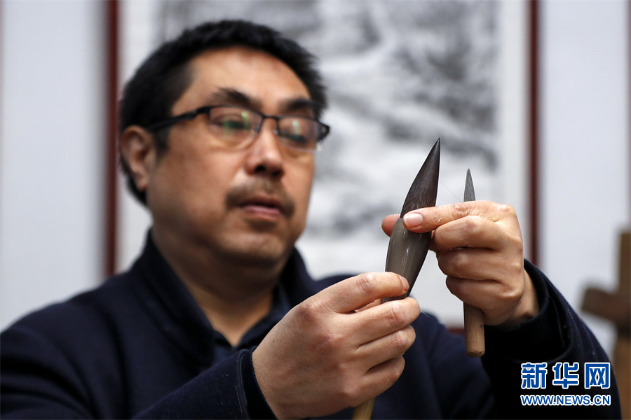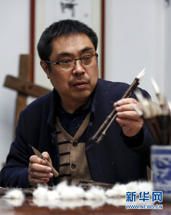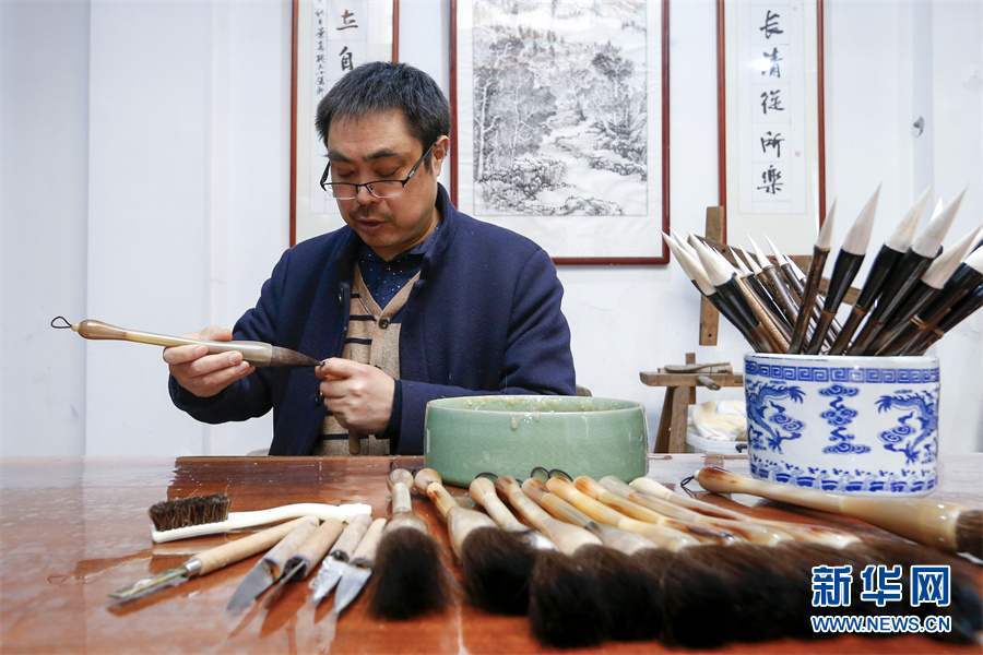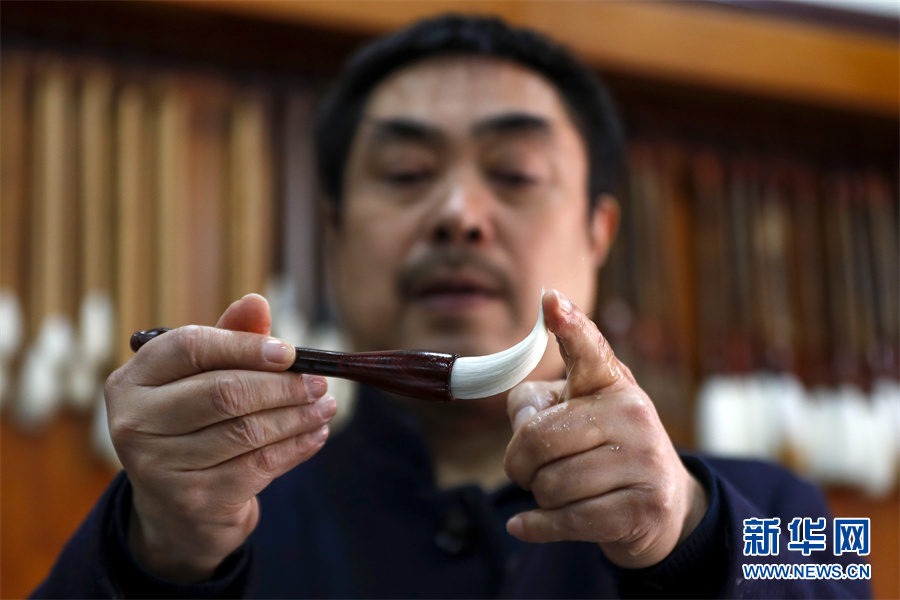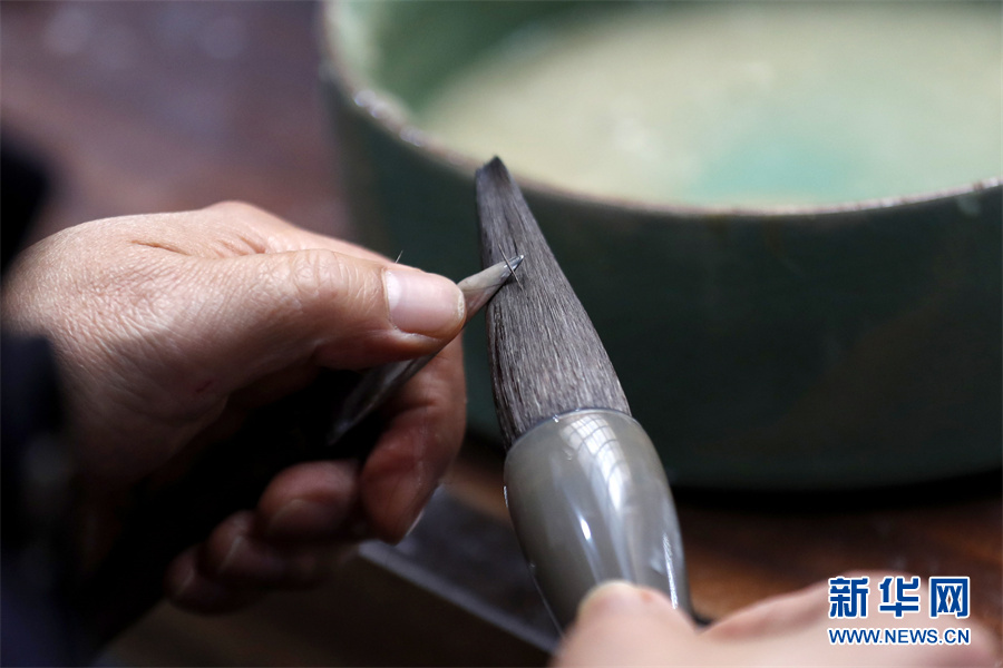 一支好的徽笔,不仅要保留传统工艺,且要在原基础上不断创新、改良。杨文尤其重视书画家对笔的使用反馈:“因为他们对用笔最挑剔,而且现代书画家创作方式和作品不断创新,对毛笔也有新的要求,他们提出的要求我总是尽力去满足,也使得制笔技艺进一步得到了提高。” 新华网发(施亚磊 摄)