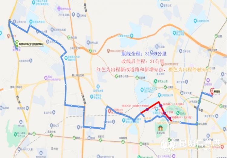 101路调整后,去程(开往小菜园立交桥方向)按原线行驶至一二一大街,经一二一大街、北门街、圆通街回原线行驶;回程不变。新增停靠“师范大学(西南联大博物馆)(去)、园西路口(北门街)(去)、丁字坡(去)、圆通街口(北门街)(去)” 等4个公交站,同时取消停靠“建设路(去)、府甬道(去)、云南大学(翠湖北路)(去)”等3个公交站。