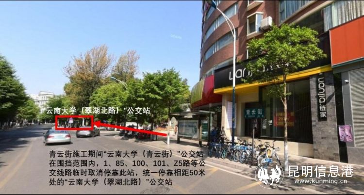 此外,“云南大学(青云街)”公交站(青云街由东向西方向,即1路开往西北部公交枢纽站方向)在此次青云街雨污分流施工中处于围挡施工范围内,施工期间1路、85路、100路、101路、Z5路等5条公交线路临时取消停靠此站,同时统一停靠“云南大学(翠湖北路)”公交站。
