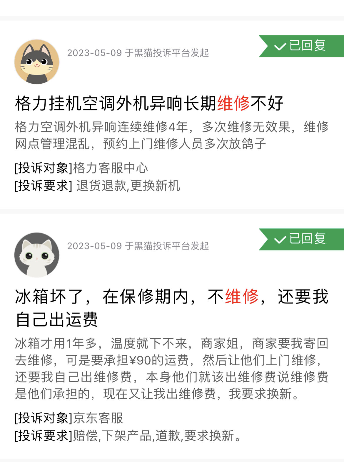 清洗冰箱后冰箱运转出问题,维修马桶5分钟300元,开锁被推荐更换1000元的锁……记者查询黑猫投诉平台发现,高价维修、机器损坏等问题十分常见。且消费者往往因为未保存凭证、没有收据、平台不作为等原因只能“吃哑巴亏”。有消费者通过微信反映维修问题之后,对方推卸责任,反被拉黑。李萌说:“当下觉得好歹窗帘修好了,问题解决就行,就当自己买了教训。”张女士随后通过下单平台投诉,“但对方解释说我们家的下水管道已经堵塞严重,必须用专门的试剂溶解,用机器打碎,已经超出了基础维修的范围。”也有网友谈到,维修人员熟知电话号码和家庭住址,担心投诉后遭遇报复行为,所以宁愿息事宁人。
