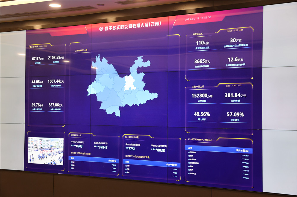 截至2022年12月31日,平台注册的销售云南产地商品的店铺近110万家;不完全统计,2022年通过拼多多平台销售的云南产地商品共21.28亿单,同比增长53.45%;2022年通过拼多多平台销售云南产地商品总交易额达668.80亿元,同比增长47.62%。其中,农副产品订单量15.28亿单,占比71.80%,同比增长49.56%;农副产品交易额381.84亿元,占比57.09%,同比增长45.27%。