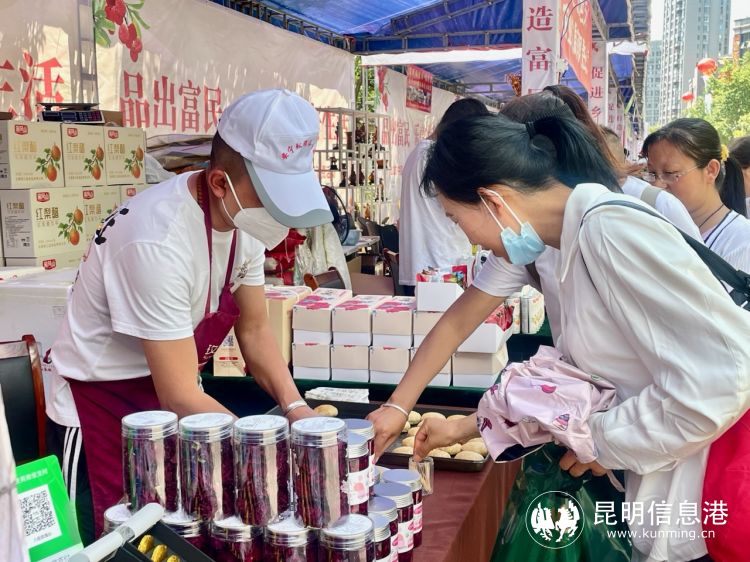 “来尝尝我们富民的杨梅”“这个杨梅大,果肉厚实”……在杨梅节主会场上河院,杨梅品鉴区人气火爆。“今天天气太热了,吃一碗杨梅果冻太爽了!”游客李小姐说。在上河院的特色产品集市上,杨梅果冻、富民山药挂面、鲜花饼等百余种特色小吃吸引众多游客尽情品尝。