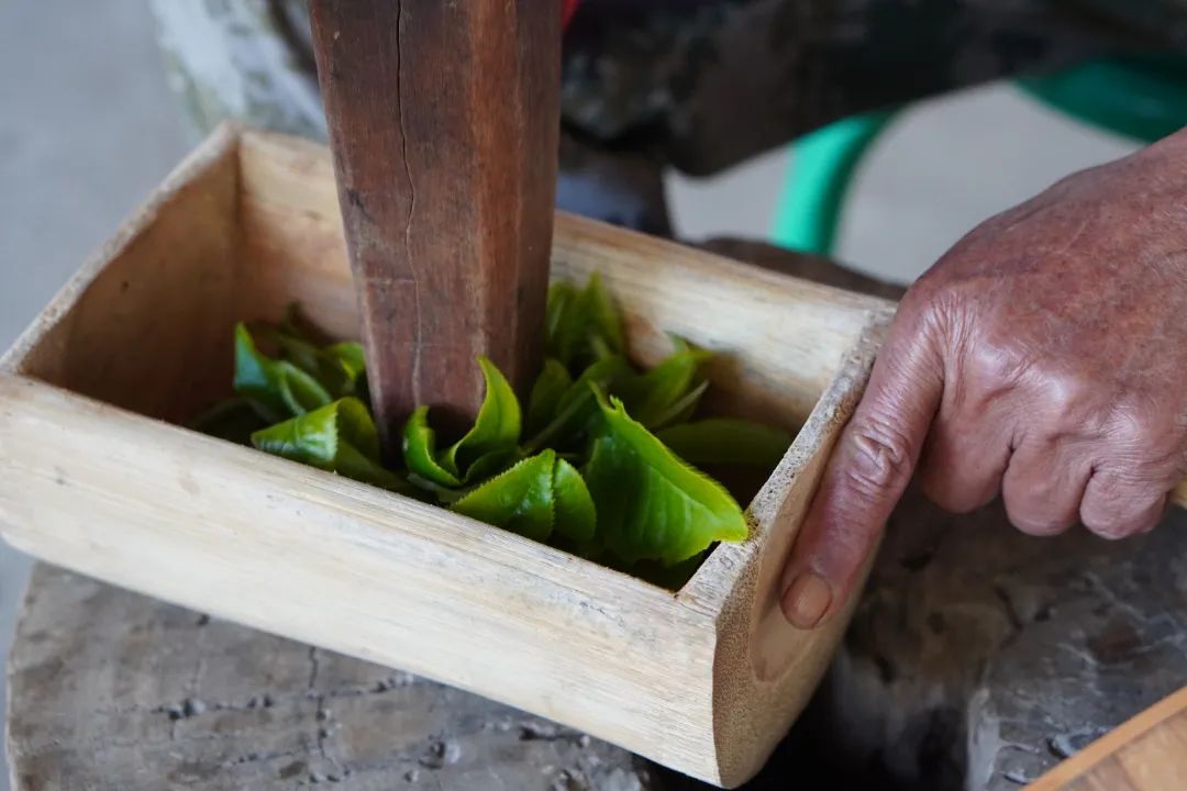 竹筒开封后,把茶叶取出,经过精心挑选,上好的酸茶会呈金黄色,发酵后的茶叶放在石臼中,用传统的脚碓舂烂,揉成小团,压成饼状,晒2天左右,剪成小块,接着再暴晒5天就能得到成品。