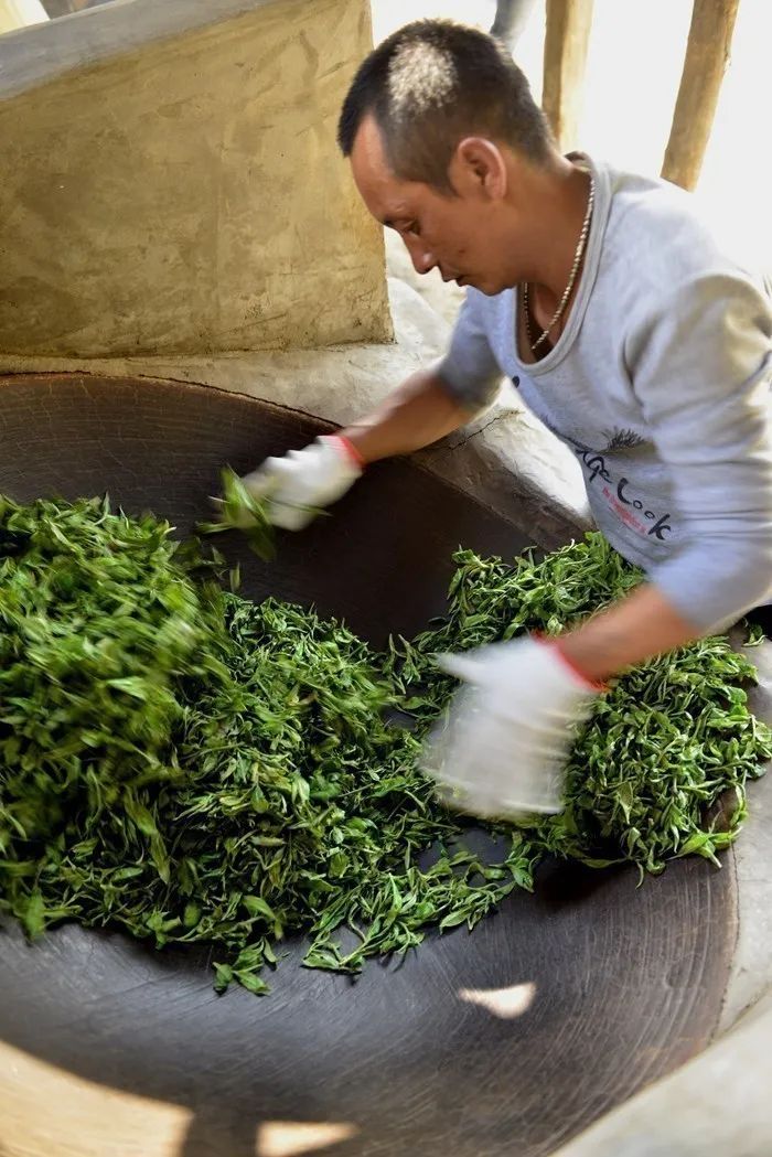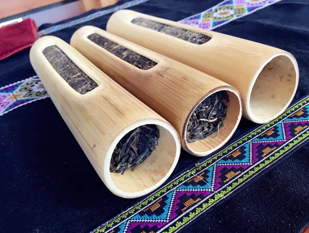 茶师会亲自挑选挺拔修长、大小适中的成熟竹子,砍下来锯成竹筒,将竹筒内壁清洗干净,把晾好的茶叶揉搓成团装到竹筒里,一层层压实。