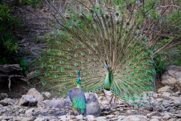 一只羽色鲜艳的雄孔雀落在一处山谷河滩旁