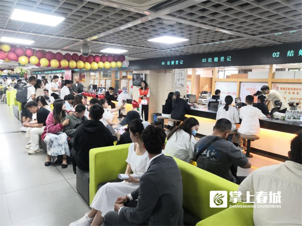 上午八时许,记者走进政务服务中心婚姻登记大厅,现场座无虚席,一眼望去都是前来登记的新人,无论是咨询处、等候大厅,还是登记窗口,都是一派忙碌而又甜蜜的景象。