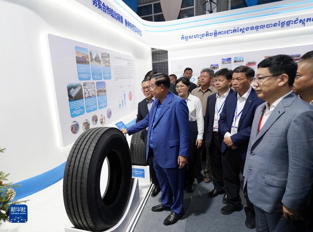 5月22日,柬埔寨首相洪森(前左)在西哈努克港经济特区参观共建“一带一路”倡议十周年西港特区成果展。新华社发(李莱 摄)