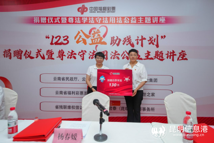 活动当天,云南省福利彩票发行中心在中国昆明济世之家举办“123公益助残计划”捐赠活动,向济世之家一百余名学员捐赠四季常服,并开展了尊法学法守法用法公益主题讲座。