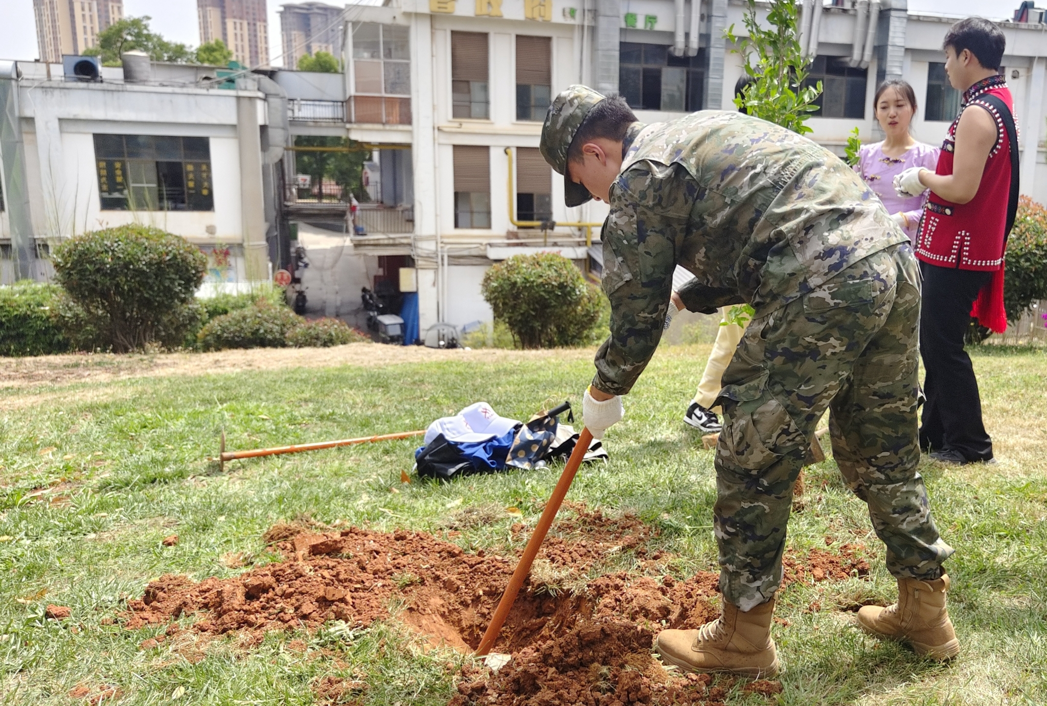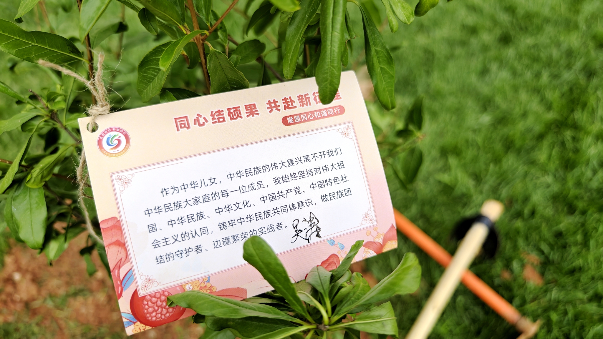 现场还开展了共植“同心林”活动。志愿者们有的挥锹挖土,有的扶苗填坑,有的培土浇水,精心种植着每棵树苗,现场氛围热情高涨,充满了劳动的欢声笑语。在大家的共同努力下,56棵新栽石榴树苗迎风挺立,萌发出盎然生机。云南工商学院学生生景佳表示:“这次植树节活动,让同学们意识到了团结的重要性,未来我们也要像石榴籽一样紧紧抱在一起,共同进步,为国家的发展而努力!”