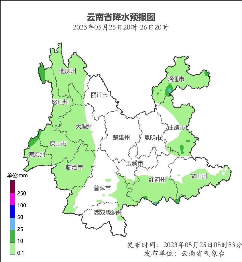 昭通、曲靖东部、文山南部、红河南部、普洱南部、临沧、德宏、保山、大理西部、怒江、迪庆多云有阵雨局部大雨,其他地区晴间多云。