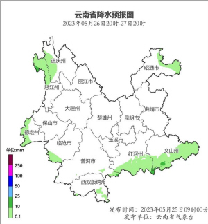 5月26日20时到5月27日20时:昭通北部、文山南部、红河南部、临沧西部、德宏西部、怒江北部、迪庆西部多云有阵雨局部中雨,其他地区晴间多云。