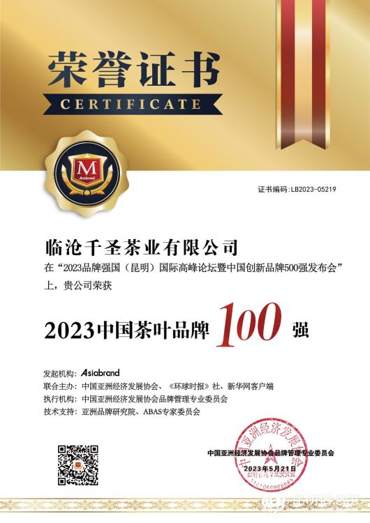 会上“千圣茶业”荣获 2023 中国茶叶品牌 100 强,临沧千圣茶业有限公司董事长杨勇智荣获中国茶叶品牌年度十大人物。两项大奖表明,临沧千圣茶业有限公司凭借多年积累的传统古法制茶工艺与品牌创新能力获得大会认可,也标志千圣茶业向着基于品牌+价值出发,在茶叶领域头部品牌企业又迈出了坚实的一步。