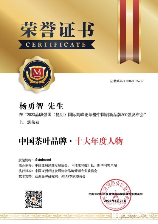 临沧千圣茶业有限公司董事长杨勇智为新时代非遗茶文化传播大使、国家级非遗(制茶)技艺传承师、国家级非遗茶文化传承师。作为公司品牌的创始人,受邀参加大会,并斩获双奖。他表示:临沧市有着稀缺珍贵、丰富的古茶树资源,公司坚信依托家乡得天独厚的茶树资源,更有信心做好千圣茶业品牌,持续提升临沧千圣茶业“品牌力”。在品牌经济时代,做好茶叶品牌价值成长的榜样。