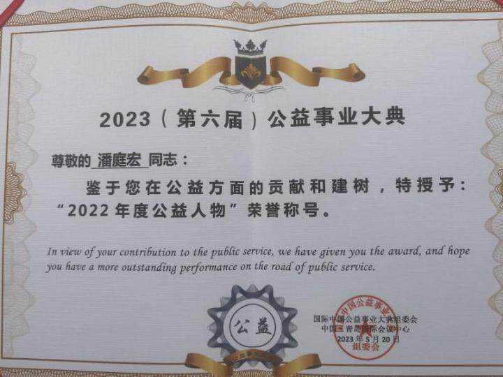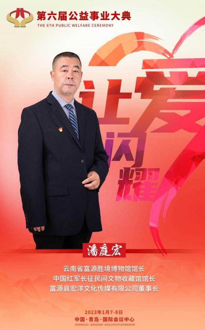 富源胜境博物馆馆长、中国红军长征民间文物收藏馆馆长、富源县宏洋文化传媒有限公司董事长潘庭宏被组委会授予“2022年度公益人物”荣誉称号。