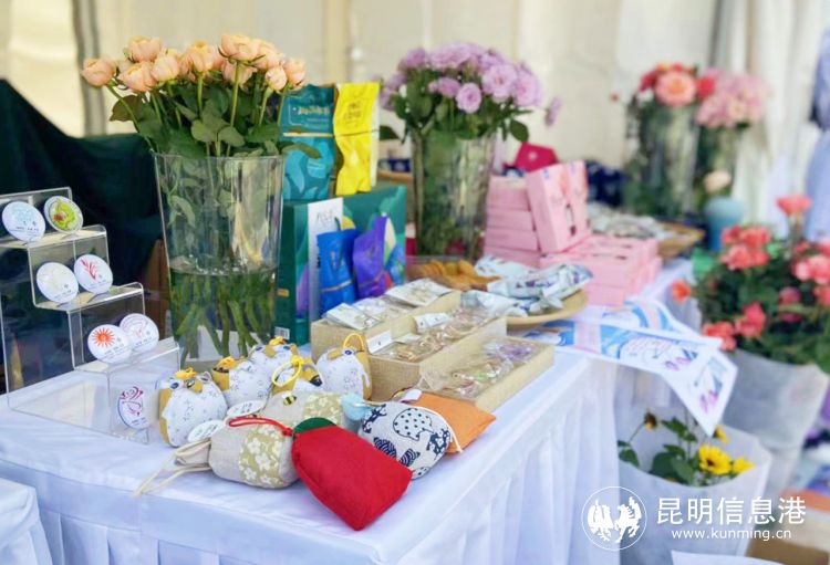 走进展区,整个空间被颜色各异的恐龙玫瑰装点着,手工香包、鲜花系列美食、花卉手工文创产品等十分惹人注目,吸引了不少参观者的目光。