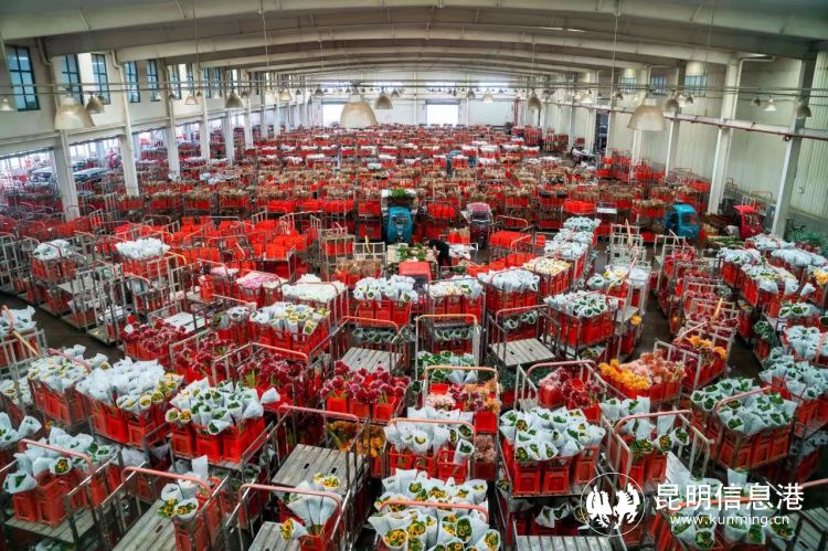 昆明国际花拍中心物流区内待转运的鲜花