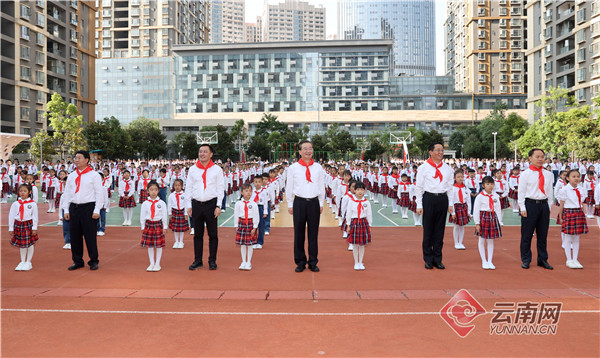 王宁、王予波来到春城小学红菱校区,与同学们一起参加少先队主题队日活动、新队员入队仪式。记者 雷桐苏 摄