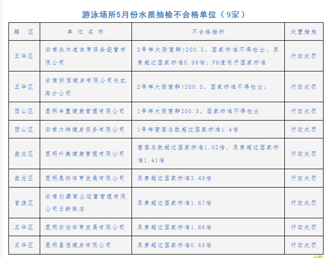 游泳池水水质检测项目为细菌总数、大肠菌群、尿素、游离性余氯、浑浊度、PH值等6项指标。针对抽检不合格9家游泳场所,昆明市卫生健康委综合监督执法局依据《公共场所卫生管理条例实施细则》规定,对9家游泳场所进行行政处罚,并责令立即改正。