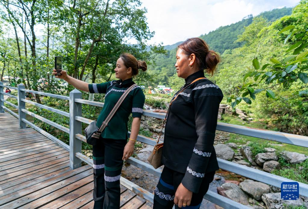 5月29日,两名游客在坪河草地景区自拍留念。新华社记者 陈欣波/摄