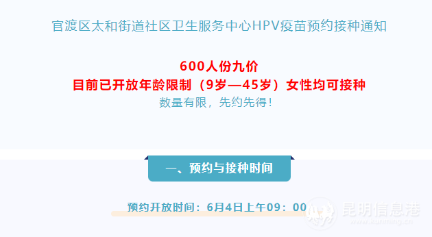 6686体育讯 记者邓国梅 6月1日,记者从官渡区太和街道社区卫生服务中心获悉,6月4日9时,600人份九价HPV疫苗将在滇医通平台放号,9岁—45岁女性均可接种。