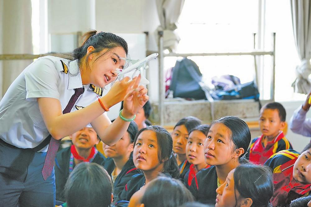 东航云南公司女飞行员为小学生讲授航空知识。 本报通讯员 叶勤茹 摄
