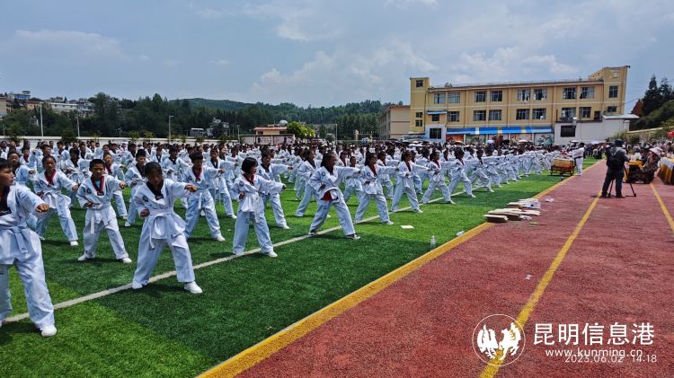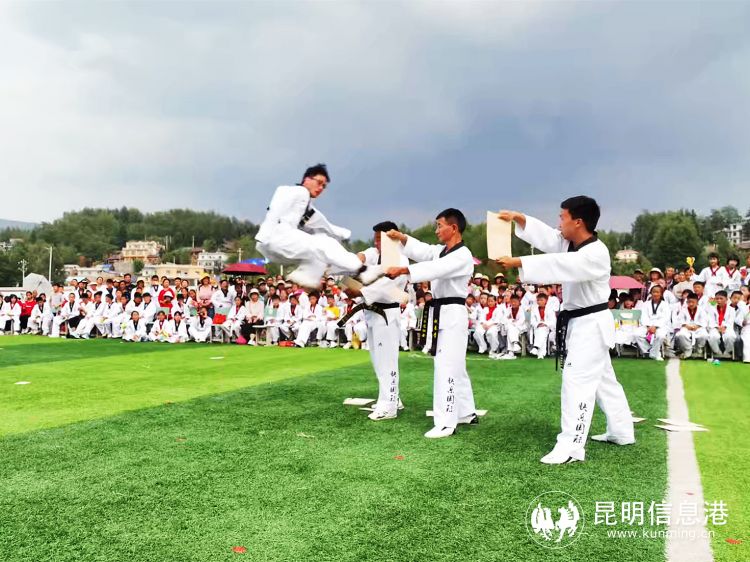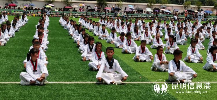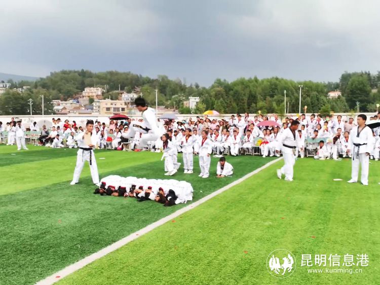 在表演现场,昆明快乐跆拳道俱乐部、昆明青少年活动中心跆拳道部张正勇先生编导的跆拳道团体架型表演把跆拳道的拳法、腿法编排成套路,与音乐相结合,根据音乐节奏、刚柔相济,动静结合,极具观赏性。表演中融入了弟子规等国学,增加学生体质的同时,引导学生有良好行为规范、学风和纪律,达到教拳育人,以拳传道的目的。该项目以后将作为学校的课间操来锻炼学生,增强学生体质。