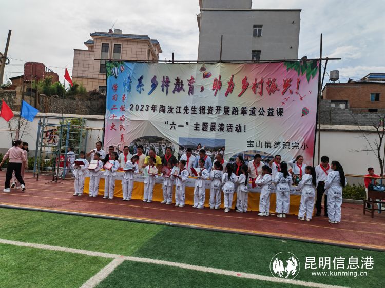 6686体育讯 记者戴兴 情系乡梓教育,助力乡村振兴。6月2日,宣威市德积完小小学生们借六一节日之际,用汗水铸就自信,给大家展示了他们将近一年刻苦训练的学习成果,呈上一台隆重的460人的跆拳道团体架型表演盛宴。