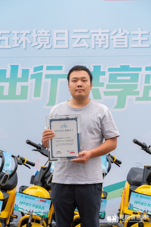 “便捷、绿色、实惠。”1996年出生的陈子源在曲靖做跑腿工作,一直使用松果电单车展工作。如今陈子源已成为曲靖的“骑行王”,过去一年,他累计骑行次数超1800次,骑行里程达到7393公里,对应的减碳量高达1970.3公斤。当天陈子源获得了由云南省生态环境厅和“强国电单车”联合颁发的“绿色生活减碳达人”证书。