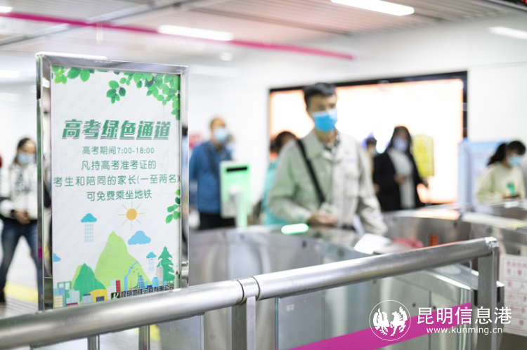 高考期间,昆明地铁全线网所有车站设置“高考绿色通道”,推行“三优一免”服务:为考生提供免费绿色通行服务,考生及2名陪同家属在考试当天可凭2023年高考准考证到客服中心领取“免费进站票”免费乘坐昆明地铁。并享受优先安检、优先进出站、优先处理乘客事务服务。