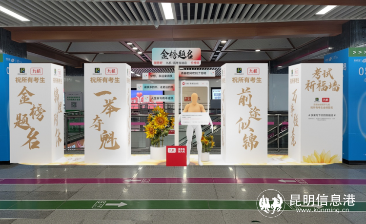 同时,昆明地铁联合九机科技共同发起“爱心助考驿站”城市公益活动,在地铁8个站点设置了“爱心助考驿站”为考生提供爱心助考包(包含纸巾、湿纸巾、创可贴,考生可凭准考证和学生证领取)以及至家长的信和免费矿泉水,站点出入口闸机放置了祝福贺卡。