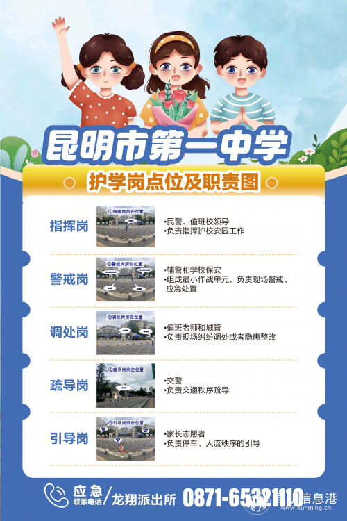 派出所紧盯护学软件构建,积极争取龙翔街道办事处、交警和学校等相关部门的支持,全面整合警察、老师、家长、保安、交警、城管等值守力量,对辖区6所中小学、幼儿园全覆盖实地踏勘、划定区域,设置指挥岗、警戒岗、调处岗、疏导岗、引导岗“五个岗位”,根据校园地形,因地制宜规划点位,按照“一校一策”形成“特色值守点位图”上墙。