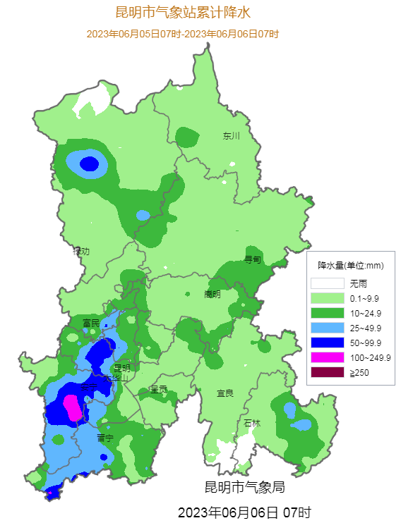 受冷空气和西南暖湿气流影响,6月5日午后到今天(6日)凌晨,昆明市出现强对流天气,普降小到中雨,安宁、晋宁、禄劝、西山区等县市区部分乡镇街道降雨较大,达到暴雨级别,其中安宁县街、晋宁打黑村降了大暴雨。