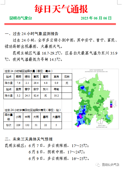 据悉,本次降雨天气过程还将持续,6月7-8日,多云间阴有阵雨,17~25℃。昆明市气象部门将严阵以待、密切监测,加强分析研判,及时发布预警信息,全力以赴做好气象保障服务工作。